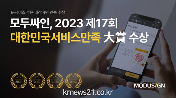 ▲ 사진=모두싸인국내 1위 전자계약 전문기업 모두싸인(대표 이영준)이 ‘2023 제17회 대한민국 서비스만족 대상’에서 E-서비스 부문 4년 연속 대상을 수상했다고 30일 밝혔다.