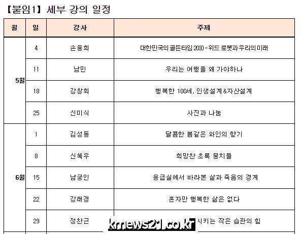 이번 1기 강좌는 총 13회 운영되며 5월 4일부터 7월 27일까지 매주 목요일 오후 7시부터 8시 40분까지 1시간 40분 간 4차산업을 비롯한 경제․역사․음악․미술 등 다양한 주제로 강의를 선보인다.