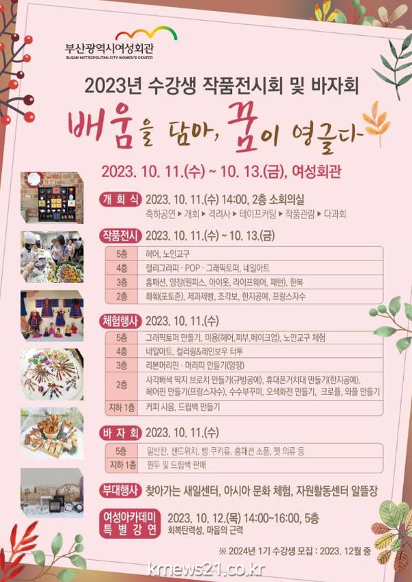▲ 사진=부산광역시부산시 여성회관은 오는 10월 11일부터 13일까지 <배움을 담아, 꿈이 영글다>라는 주제로 「2023년 수강생 작품전시회 및 바자회」를 개최한다고 밝혔다.