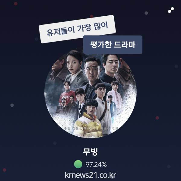 더불어 디즈니+ 시리즈 <무빙>이 가장 많이 평가한 드라마로 이름을 올렸다. 초능력 액션 히어로 드라마 <무빙>은 키노라이츠 주간 통합 콘텐츠 랭킹 8주 연속 1위 등 이례적인 기록을 세우며 장기간 입소문을 만들어냈다.