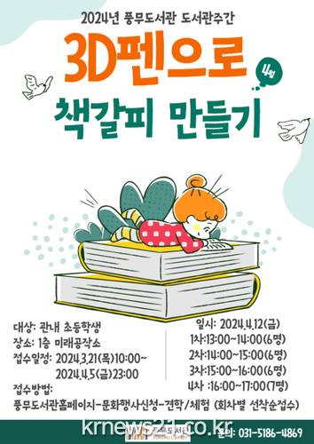 ▲ 사진=김포시김포시(시장 김병수) 풍무도서관이 2024년 도서관 주간 「도서관, 당신의 내일을 소장 중입니다.」 를 맞이하여 3D펜으로 책갈피 만들기 수업을 오는 4월 12일 13시~17시까지 운영한다고 밝혔다.