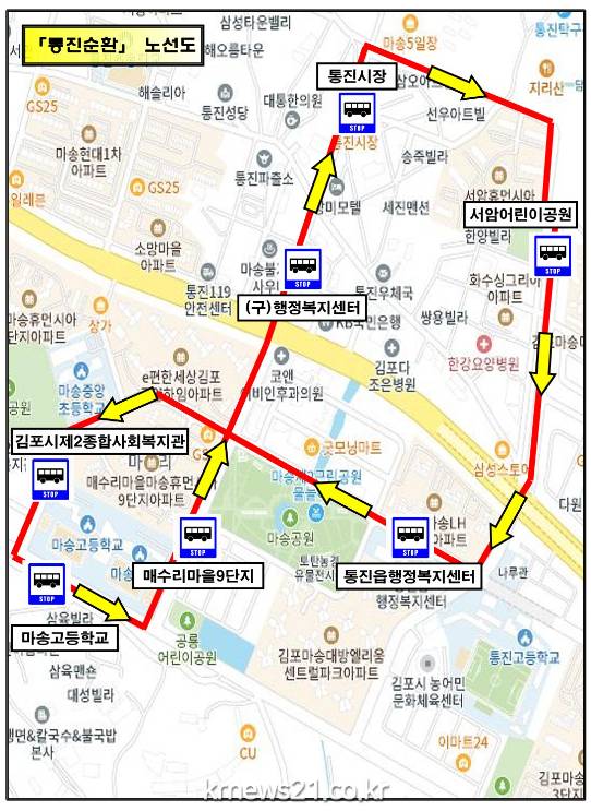 ▲ 사진=김포시교통 혈관 뚫기로 시민이 편리한 교통환경 조성에 박차를 가하고 있는 김포시(시장 김병수)가 관내교통편의 증진에도 앞장선다. 시는 서암어린이공원에서 통진읍행정복지센터를 연결하는 통진순환 마을버스 노선을 신설하고 오는 4월 6일부터 운행한다고 밝혔다.
