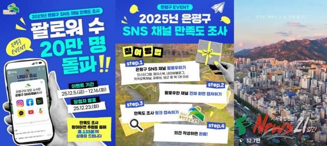 ▲ 사진=은평구청서울 은평구(구청장 김미경)는 구 공식 사회관계망서비스(SNS) 누적 팔로워가 20만 명을 돌파함에 따라, 주민 소통 강화를 위해 개설 이후 처음으로 만족도 조사를 시행한다고 밝혔다.
