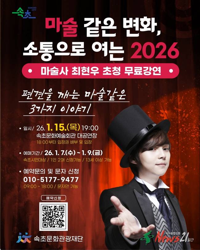 ▲ 사진=속초시속초문화관광재단(이사장 이병선)이 오는 1월 15일(목) 오후 7시, 속초문화예술회관 대공연장에서 마술사 최현우를 초청해 강연과 퍼포먼스가 결합한 기획공연 ‘마술 같은 변화, 소통으로 여는 2026’을 개최한다.