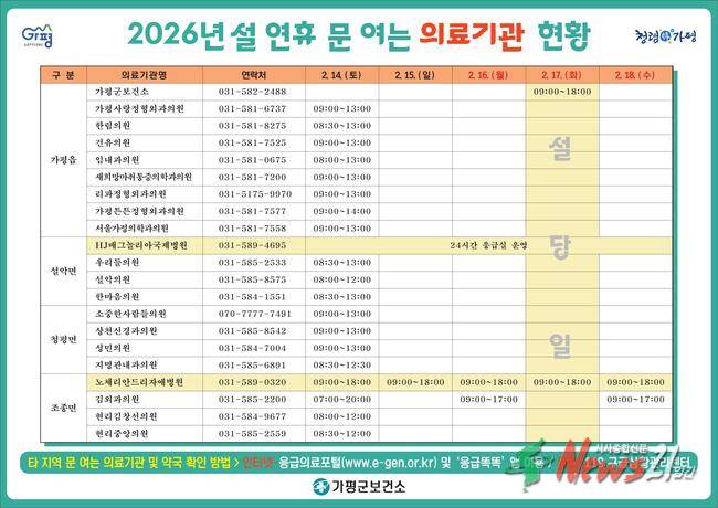 가평군 관계자는 “설 연휴 기간에도 군민들이 안심하고 의료 서비스를 이용할 수 있도록 응급의료체계 운영에 최선을 다하겠다”며 “군민들께서는 문 여는 의료기관과 약국을 미리 확인하고 갑작스러운 상황에 대비해 모두가 행복하고 안전한 명절을 보내시기 바란다”고 말했다.
