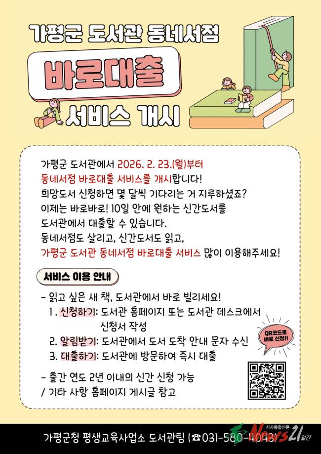가평군 도서관은 23일부터 이용자 편의 향상과 지역 서점과의 상생을 위해 희망도서 공급 서비스인 ‘동네서점 바로대출’ 시스템을 도입한다고 밝혔다.
