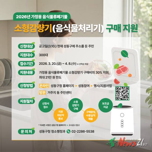 올해는 소형 감량기 구매비용의 30%, 가구당 최대 21만 원까지 총 300세대를 대상으로 보조금을 지원할 예정이다. 신청 기간은 3월 20일부터 4월 8일까지 선착순으로, 거주지 동주민센터 방문 또는 성동구청 누리집(홈페이지) 신속 예약을 통해 신청할 수 있다.