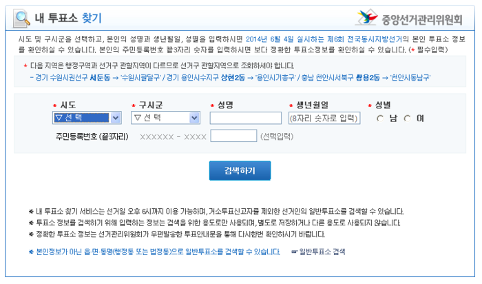 자신의 시도 및 구시군을 선택하고, 본인의 성명과 생년월일, 성별을 필수로 입력하고 추가로 본인의 주민등록번호 끝3자리 숫자를 입력하면 보다 정확한 투표소정보를 확인할 수 있다.