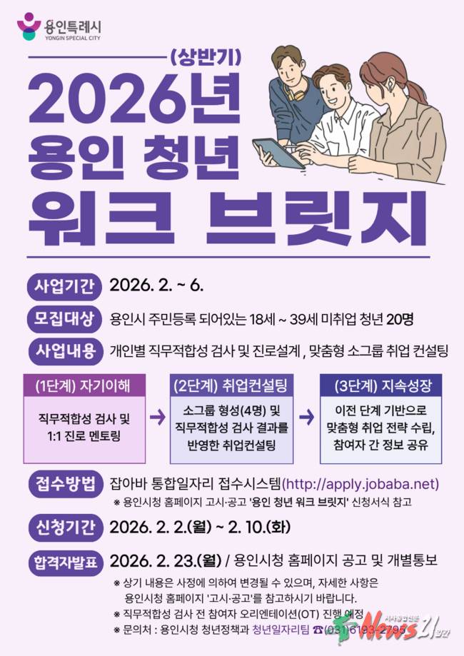 용인특례시(시장 이상일)는 2월 2일부터 10일까지 상반기 청년 맞춤형 진로 설계 프로그램 참가자를 20명을 모집한다고 27일 밝혔다. 시는 상·하반기 구직활동에 어려움을 겪는 지역 청년들에게 맞춤형 취업 설계 지원 프로그램을 제공하고 있다. 모집 대상은 공고일 기준 용인에 주소를 둔 18세 이상 39세 이하 미취업 청년이다. 프로그...
