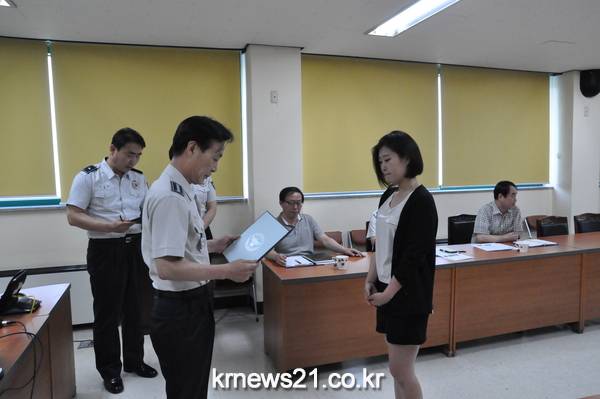 안성경찰서(서장 서상귀)에서는 ’15. 6. 12(금) 09:00경, 안성경찰서 2층 내혜홀에서 관내 협력단체와 범죄예방활동에 적극 참여 및 내리 경찰초소 이전에 기여한 중앙대 총여학생회장에게 감사장을 수여 했습니다.