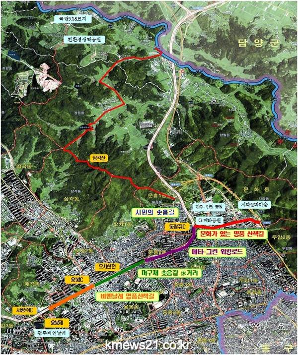 송광운 북구청장은 “이번 비엔날레 명품산책길은 무등산 군왕봉과 비엔날레지구까지 도심 속 녹지축이 연결되는 것으로, 주민들에게 가까운 거리에서 편하게 즐길 수 있는 산책공간이 될 것으로 기대한다”며, “앞으로도 도심 속에서 주민들이 행복을 느낄 수 있도록 산책로 인프라 확충에 최선을 다하겠다”고 말했다.