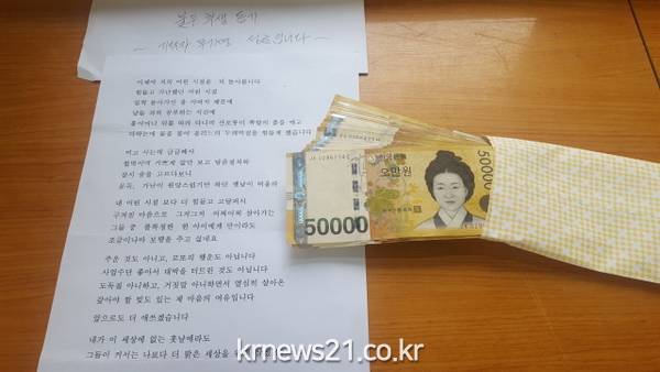 동봉 된 편지에서 ‘힘들고 가난했던 어린 시절, 남들 공부할 시간에 힘들게 있을 했다.’는 그는 ‘먹고 사는데 급급해 잠시 숨을 고르다보니 가난했던 어린 시절이 원망스럽고 자신보다 더 힘들고 어려운 시절을 겪고 있는 아이들에게 조금이나마 보탬이 되고 싶다.’라고 적혀있었다. 편지의 말미에서 그는 ‘가난하고 힘든 학우들을 위해 써주기를 바란다.’면서 자신이 누구인지는 묻지 말아달라는 당부의 말을 남겼다.