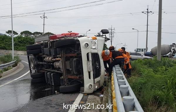 119구조구급대가 현장에 도착한 바 운전자가 몰던 트럭이 급커브 구간에서 무게중심을 잃고 차량이 한쪽으로 쏠려 전복된 상황으로 소방대원들은 차안에 갇힌 운전자를 경추보호대 착용 등 응급조치를 실시하며 안전하게 구조했다.