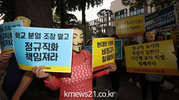 전국 4만6000여 명 기간제 교사들 대표체인 전국기간제교사연합회(전기련)는 12일 보도자료를 내고 “교육부가 ‘정규직 전환 심의위원회’에서 결정되지 않은 사항을 왜곡해 지난 11일 발표했다”고 주장했다.