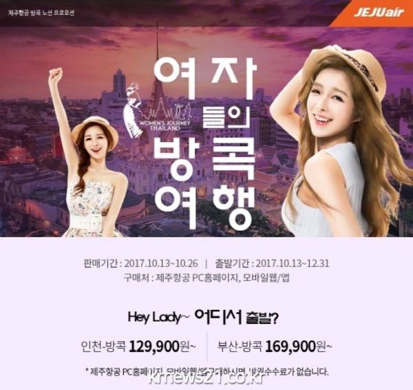 제주항공은 오는 26일까지 '여자들의 방콕여행'이라는 주제로 항공권 프로모션을 진행한다고 18일 밝혔다. 탑승일을 기준으로 12월31일까지 이용할 수 있는 태국 방콕노선 편도 항공권이다.