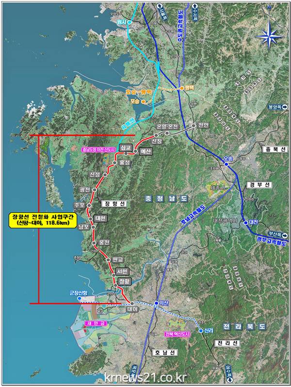 김태흠 의원(보령·서천)은 충남 아산 신창 ~ 전북 익산 대야를 연결하는장항선 복선전철 건설사업(연장 121.6㎞)이 드디어 예비타당성(이하 예타) 관문을 통과해 본격 추진되게 됐다고 30일 밝혔다.