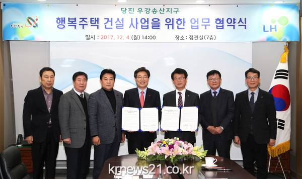 당진시에 따르면 시와 LH 대전충남지역본부는 4일 당진시청 접견실에서 김홍장 시장과 김양수 대전충남지역본부장이 참석한 가운데 당진우강송산지구 행복주택 건설을 위한 업무 협약을 체결했다.
