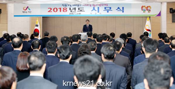 서산시가 2일 시청 대회의실에서‘2018년 시무식’을 열고 무술년(戊戌年) 새해의 힘찬 발걸음을 내딛었다.