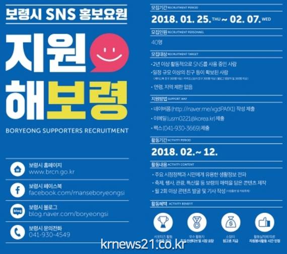 시는 활동경력과 능력, 의지 등 3가지 항목별로 자체 평가 후 대상자를 선정, 2월 중 보령시 홈페이지와 페이스북 등에 통해 공지할 계획이며,선정자는 올해 연말까지 주요 시정정책과 시민에게 유용한 생활정보 전파, 축제, 행사, 관광, 특산물 등 보령의 매력을 담은 콘텐츠 제작해 홍보하면 된다.