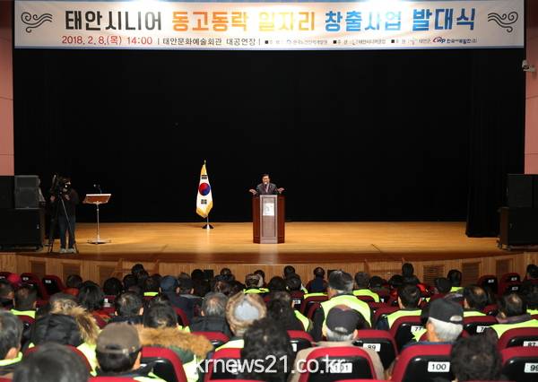 태안군은 지난 8일 군 문화예술회관에서 한상기 군수를 비롯, 장정근 태안시니어클럽 관장과 김동민 (사)대한노인회 태안군지회장, 유재섭 한국노인인력개발원장 직무대행, 이용희 군의장, 노인일자리 참여자 등 300여 명이 참석한 가운데 ‘2018 태안군 시니어 동고동락 일자리창출 사업 발대식’이 열렸다고 밝혔다.