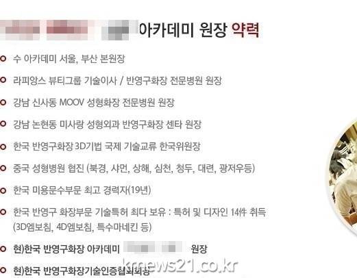 현재 원장 신모씨는 자신이 운영하는 D반영구화장아카데미의 광고에 자신이 마치 의사 면허가 있는 것처럼 성형전문병원의 원장으로 허위 기재를 하고 있으며, 허위 세무신고와 수강생들을 상대로 한 주민등록번호 불법수집 등을 하고 있고, 뿐만 아니라 교육과정에서 불법시술까지 버젓이 하고 있는 것으로 드러났다.
