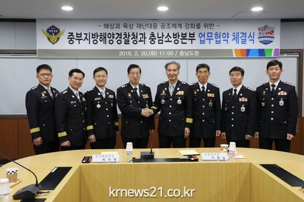 충남소방본부(본부장 이창섭)가 중부지방해양경찰청과 손을 잡고 육상과 해상에서 재난대응 업무의 공조체계를 강화한다.