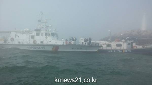 ▲ 2017년 5월 1일 짙은 해무로 인해 낚시어선이 대천항 입항중 방파제와 충돌하여 해양경찰이 구조장면