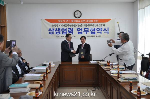 충남역사문화연구원(원장: 이종수, 이하 ‘연구원’)은 18일 충남‧세종향토사연구연합회(회장: 최석원, 이하 ‘연합회’)와 홍성문화원에서 지역 향토사 연구 활성화와 저변 확대를 중심으로 학술교류 협력 증진을 위한 업무협약을 맺었다.