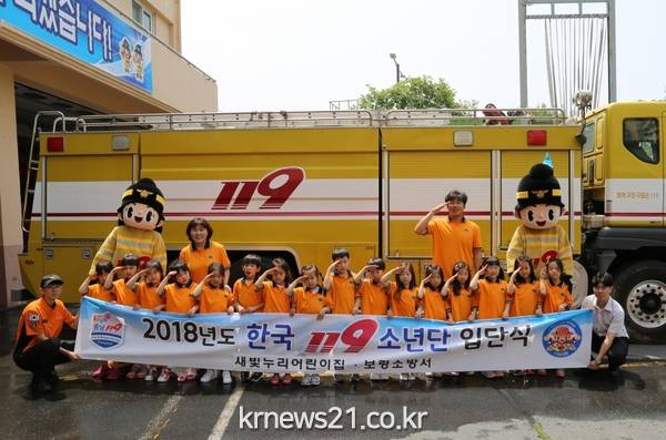 ▲ 새빛누리어린이집 한국119소년단원을 대상으로 입단식 기념사진
