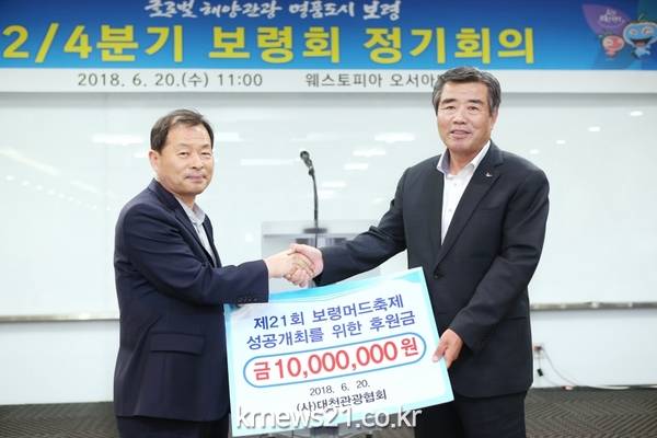 보령시(시장 김동일)는 20일 오전 웨스토피아에서 열린 2분기 보령회 정례회에서 임완식 대천관광협회장으로부터 제21회 보령머드축제 후원금 1000만원을 기탁받았다고 밝혔다.