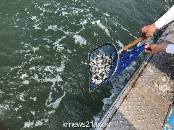 ▲ 감성돔 치어 방류장면 충남도 수산자원연구소 관계자는“올해 대하, 꽃게, 주꾸미, 자주복등 다양한 수산종자 1460여만마리를 연안시·군 16개소에 방류해 자원조성 및 어업인 소득증대에 기여해왔으며, 앞으로도 지속적인 자원 조성을 통해 생산량을 늘려 어업인 소득증대 기여 및 종자 양성기술에도 최선을 다 할 계획”이라고 말했다 도 수산자원연구소는 고부가가치 어종인 감성돔의 치어 방류가급감하는 수산자원을 회복하고 나아가 어업인 소득증대로 이어질 것으로 기대하고 있다. | |||