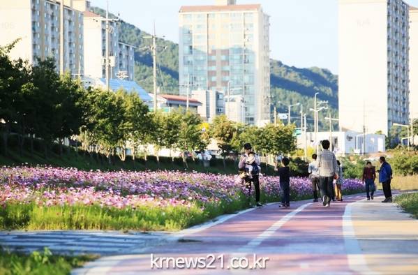 ▲ 대천천 자전거도로 인근에 가을의 전령 코스모스 만개장면