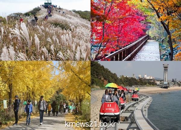▲ 보령시 가을여행 4선 오서산 억새 성주산 가을단풍 청라 은행마을 대천 해수욕장 레일 바이크 좌 부터)