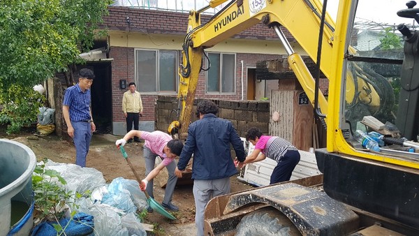 고창읍행정복지센터(고창읍장 이선구)가 9일 태풍 링링으로 인해 고창읍 소재 독거노인 집 담장이 무너져 망연자실하고 있는 어르신 댁을 방문해 위로했다.