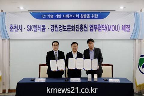 춘천시는 16일 춘천시청에서 SK텔레콤과 ‘ICT 기술 기반 사회적 가치 창출을 위한 업무협약’을 체결했다고 밝혔다. 체결식에는 이준호 SK텔레콤 SV추진그룹장, 이재수 춘천시장, 김흥성 강원정보문화진흥원장 등이 참석했다.