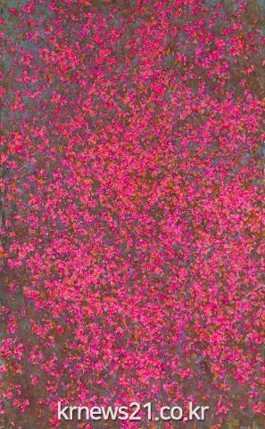 코로나19로 닫혀있던 갤러리 문이 열리면서 선보이는 이번 전시회는 은근한 생명력을 전해준다. ‘만행’은 강을 거스르는 연어처럼 고단한 세상을 딛고 나아가는 역동성이 느껴진다. ‘꽃이 지기로서니 바람을 탓하랴’ 역시 떨어지는 붉은 꽃잎들이 화폭 밖으로 뒹굴어 나올 듯 하다.