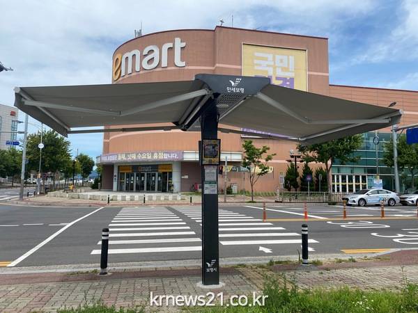 시는 터미널·문화의전당·주공사거리, 동대·명천초등학교, 동대센트럴파크·이편한세상 아파트 등 유동 인구가 많고 보행자가 신호를 기다리는 장소를 중심으로 관내 31개소에 스마트 그늘막을 설치했다.