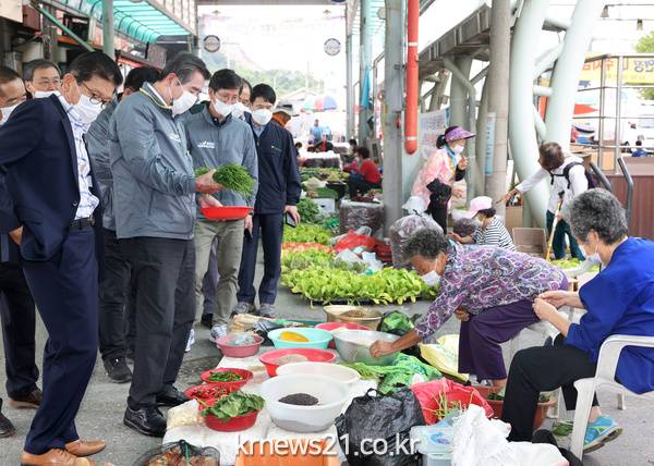 이날 김 시장은 웅천시장을 방문해 사전에 구입한 보령사랑상품권으로 장을 보고, 코로나19 장기화에 따른 소비패턴의 급격한 변화로 생업에 막대한 어려움을 겪고 있는 시장 상인들을 격려했다.