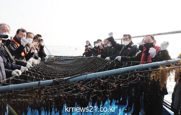 이날 김 시장은 어선에 탑승해 해상에서 김 양식 현장 및 채취작업을 살폈으며, 양식어업인들의 애로사항을 청취하고 양식업 및 가공업 간 상생협력을 통한 발전방안 등에 대해 논의하는 시간을 가졌다.