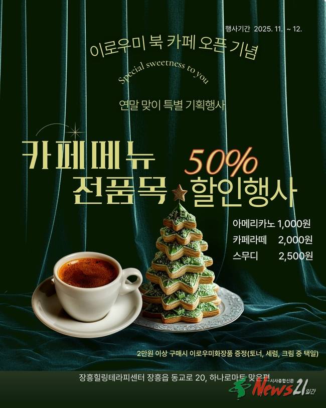 배권세 장흥힐링테라피센터장은 “이로우미 북 카페 오픈을 통해 센터를 방문하는 모든 분들께 휴식과 힐링을 함께 제공하고자 한다”며, "연말을 맞아 준비한 이번 특별 행사를 통해 많은 분들이 저렴한 가격으로 맛있는 음료와 함께 따뜻한 연말을 보내시기를 바란다“고 전했다.