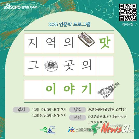 재단 관계자는 “지역의 맛과 이야기를 통해 속초의 문화적 정체성과 시민들의 일상을 다시 바라보는 시간이 되길 바란다”며 “연말을 앞두고 준비한 인문학 특강에 많은 관심과 참여를 부탁드린다”고 말했다.