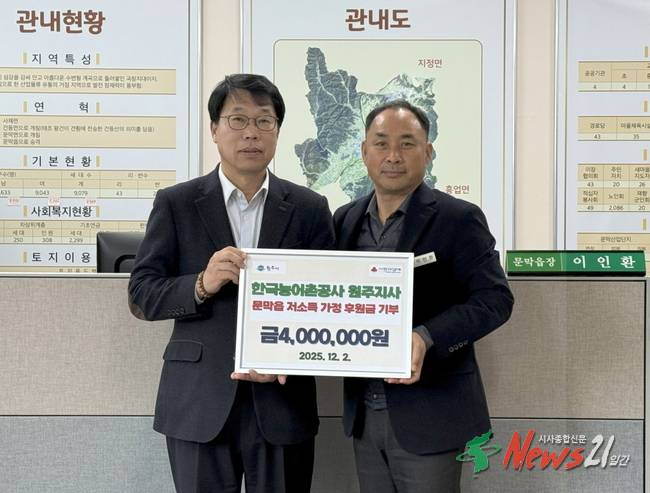 이인환 문막읍장은 “지역 저소득층을 위해 나눔을 실천해 주신 한국농어촌공사 원주지사에 감사드린다”라며, “후원금은 도움이 필요한 이웃들을 위해 소중히 사용하겠다”라고 말했다.