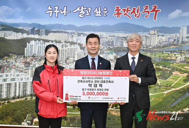 김영길 중구청장은 “지역사회를 위해 꾸준히 의미 있는 나눔을 실천해 주셔서 감사드린다”며 “따뜻한 마음을 담아 도움이 필요한 가정에 후원금을 잘 전달하겠다”고 밝혔다.