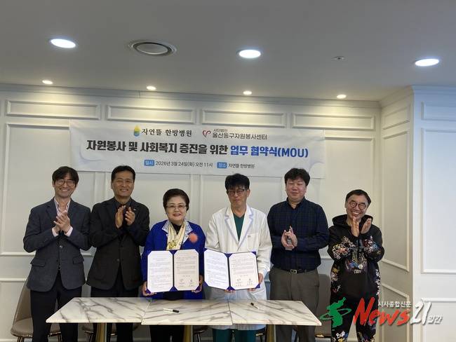 (사)울산동구자원봉사센터(이사장 이순자)와 자연뜰한방병원(병원장 김호채)은 3월 24일 자연뜰한방병원에서 지역사회 자원봉사 활성화와 복지증진을 위한 업무협약(MOU)을 체결했다.