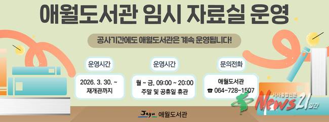 ❍ 임시 자료실은 오는 3월 30일(월)부터 애월체육관(애월읍 일주서로 6349) 2층 다목적실에 마련해 운영한다. 평일 오전 9시부터 오후 8시까지 이용할 수 있으며, 주말과 공휴일은 휴관한다. 자료실에서는 도서 대출·반납 서비스를 제공해 휴관 기간 중 이용자의 독서활동 공백을 최소화할 계획이다.
