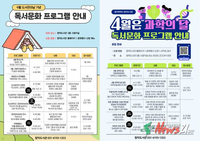 프로그램 참여 신청은 4월 1일부터 청덕도서관 누리집(lib.yongin.go.kr/cheongdeok)에서 공지사항을 확인하거나 전화(031-6193-1353)로 문의하면 된다.