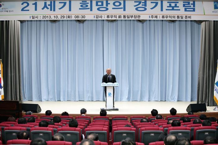 경기도는 29일 북부청사 대강당에서 김문수 경기도지사를 비롯한 도청 직원 약 250여명이 참석한 가운데 류우익 전 통일부장관을 초청, ‘류우익의 통일 준비’라는 주제로 ‘21세기 희망의 경기포럼’을 개최했다.