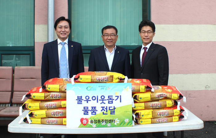 광주시 기업인협회 송정지회 회원인 이찬호(송정동 자율방재단 대장), 문병훈(성일측량설계공사 대표)씨는 관내 저소득 주민들을 위해 10kg 백미 40포(100만원)를 지난 4일, 남기삼 송정동장에게 기탁했다.