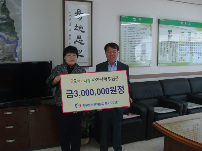 인구보건복지협회 경기도지회 아가사랑 후원회(과장 이미자)에서는 지난 29일 오포읍사무소를 방문, 아가사랑 치료비 지원 대상으로 선정된 장애아동에게 후원금 300만원을 전달했다.