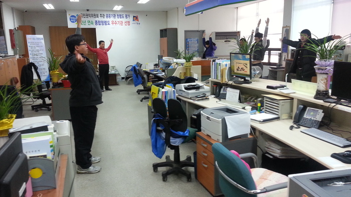 매일 아침 8시 50분에 직원들이 모여서 5분간 건강체조를 한 후 1분 스피치, 공지사항 전달, 청렴구호(청렴․친절․소통은 일죽이 최고야!)를 외치고 하루를 시작한다.